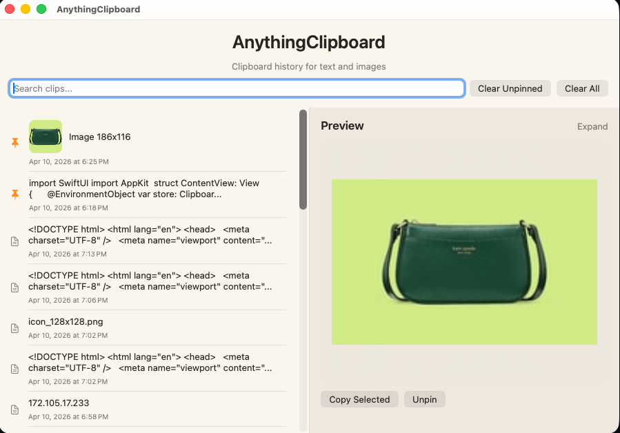 AnythingClipboard helps you save, search, and reuse copied text and images in one clean macOS app. Stop losing important snippets. Keep everything you copy close, searchable, and ready when you need it.